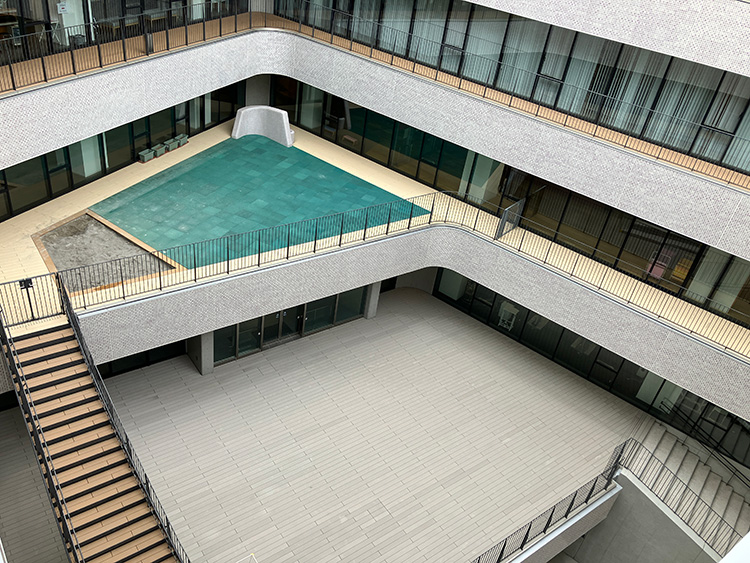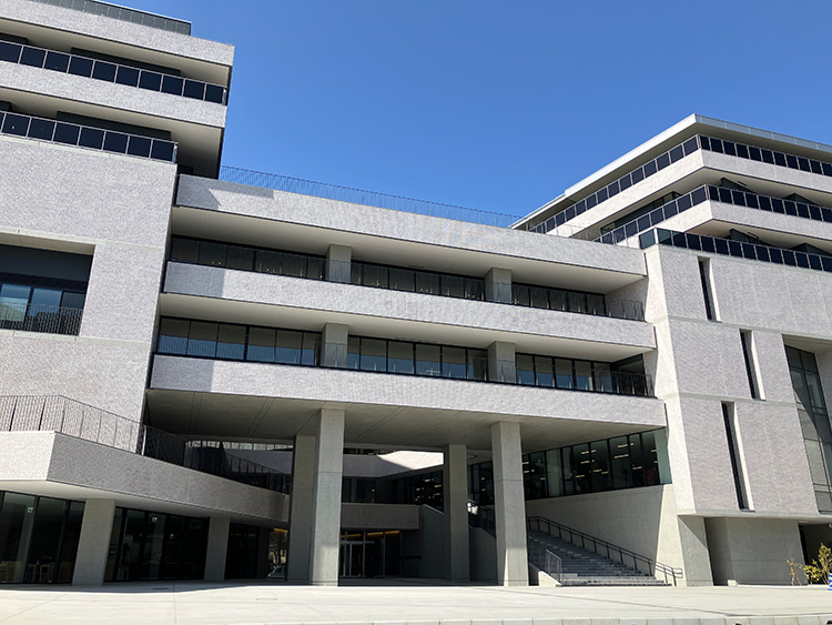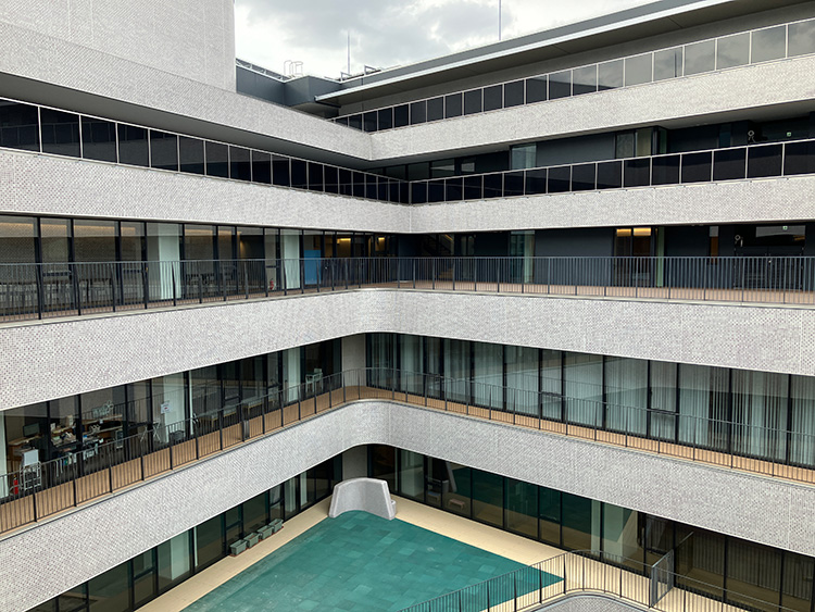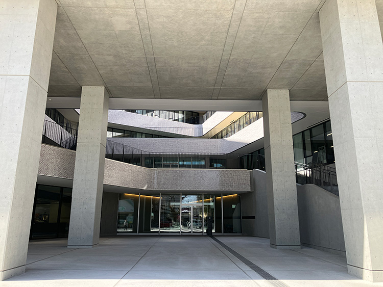 神社側に開かれた多用途のひろば、各階に設けられたテラス、広いガラス面による自然光の取り込みなど、外とのつながりを意識した設計がなされている。建物中央には広い吹き抜け空間が設けられ、視線が抜ける構成となっている。上下階の気配も自然に感じられ、建物全体がゆるやかにつながっている印象を受ける。
