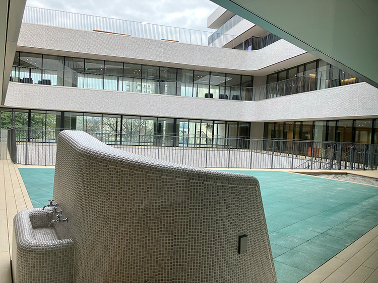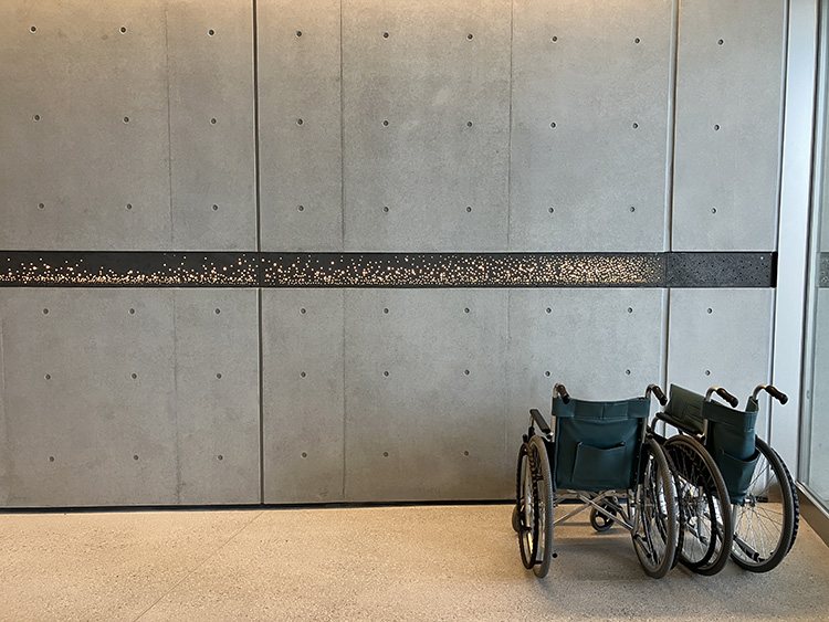 見学中、特に印象に残ったのは、理事長自らが素材選びから空間構成に至るまで深く関わっている点である。外装のタイルや内装の質感、照明に至るまで、細部にわたってその意向が反映されているという。理念を言葉にとどめず、空間として具体化しようとする姿勢が建物全体から伝わってくる。