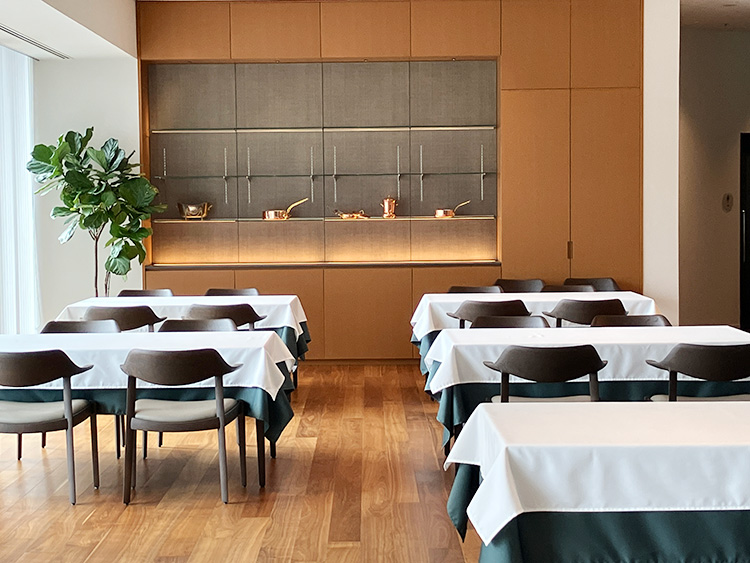 来訪者を迎える1階には直営のレストランがある。店内は大きなガラス面から自然光が差し込み、コンクリートと木の素材が調和する落ち着いた空間である。一人で静かに過ごすことも、特別な日の食事を楽しむこともできる、洗練された雰囲気が漂う。