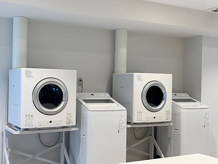 また、居室内に洗濯機置き場はなく、洗濯は無料の共用ランドリー設備を利用する。住戸内の設備を最小限にとどめ、その分を共用空間で補う暮らし方が前提とされていることがうかがえる。